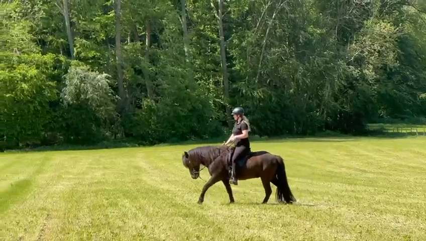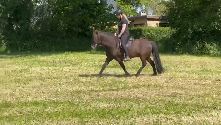 Flosi ist ein hübscher Rappe mit Stern und viel Behang. Er wird dieses Jahr 11. Wenn er gut im Training ist, 'schaltet' er sich sehr gut. Momentan arbeiten wir nach der Winterpause wieder dran. Sein Tölt geht gut bis ins mittlere Tempo. Trab und Galopp haben angenehmen Schwung. Als Fünfgänger bietet er auch den Pass gerne an.